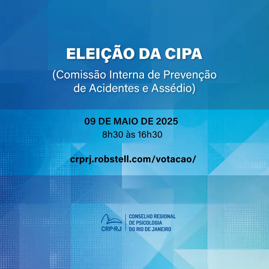 O Conselho Regional de Psicologia do Rio de Janeiro – CRP-RJ, por intermédio de sua Diretoria, CONVOCA suas funcionárias (os) para participar da eleição da CIPA – Comissão Interna de Prevenção de Acidentes e Assédio, de acordo com a legislação vigente da Norma Regulamentadora NR-5, a ser realizada no dia 09 de maio de 2025 no horário das 8h30 às 16h30, eletronicamente pelo link: https://crprj.robstell.com/votacao/, ficando aberto o período de 08 a 22 de abril de 2025, para as inscrições das funcionárias (os) interessadas (os) em concorrer e participar da CIPA, como representantes, para mandato de 12 meses, podendo ser reeleito.